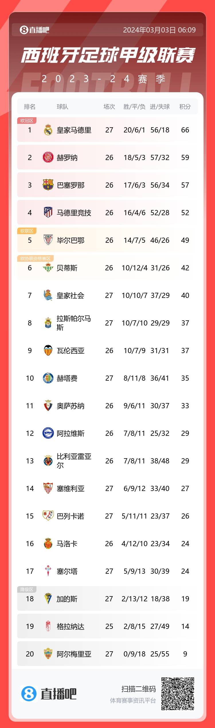3月3日讯 西甲第27轮,皇马2-2瓦伦西亚,联赛21轮不败,先赛7分领跑。最新西甲积分榜如下: