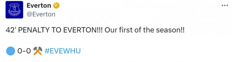 比赛第42分钟,埃弗顿获得点球,埃弗顿官方社媒也兴奋地发动态,写道:埃弗顿的点球!!!我们本赛季第一个!!