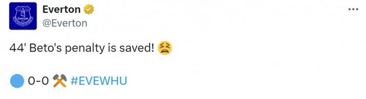 3月3日讯 英超第27轮,埃弗顿主场1-3不敌西汉姆联,本场比赛,埃弗顿在本赛季英超第一次获得点球。比赛第42分钟,埃弗顿获得点球,埃弗顿官方社媒也兴奋地发动态,写
