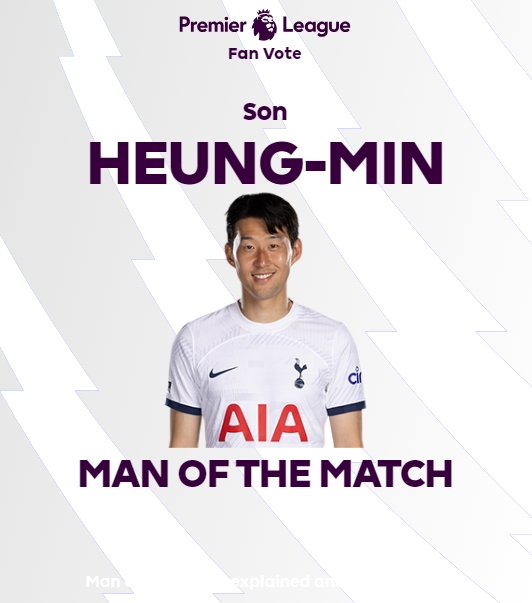 英超官方消息,孙兴慜当选本场比赛最佳球员。