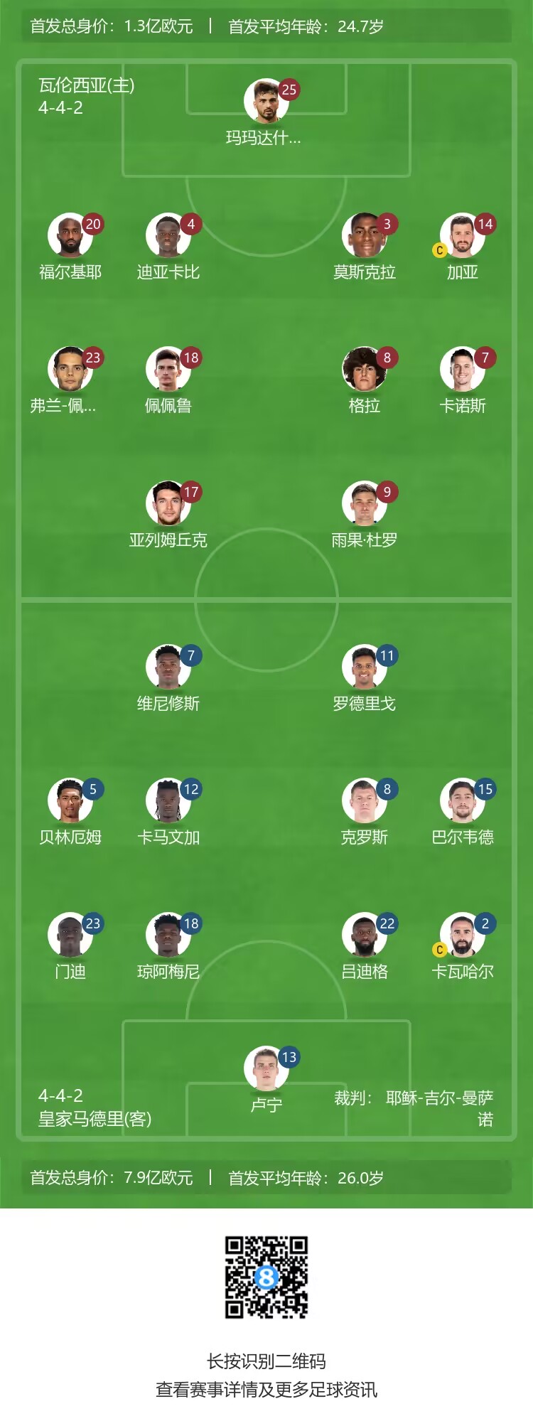 瓦伦西亚首发:25-马马达什维利、20-富尔基耶、4-迪亚卡比、3-莫斯克拉、14-加亚、18-佩佩鲁、8-古埃拉、23-弗兰-佩雷斯、7-卡诺斯、17-亚列姆丘克、9-杜罗