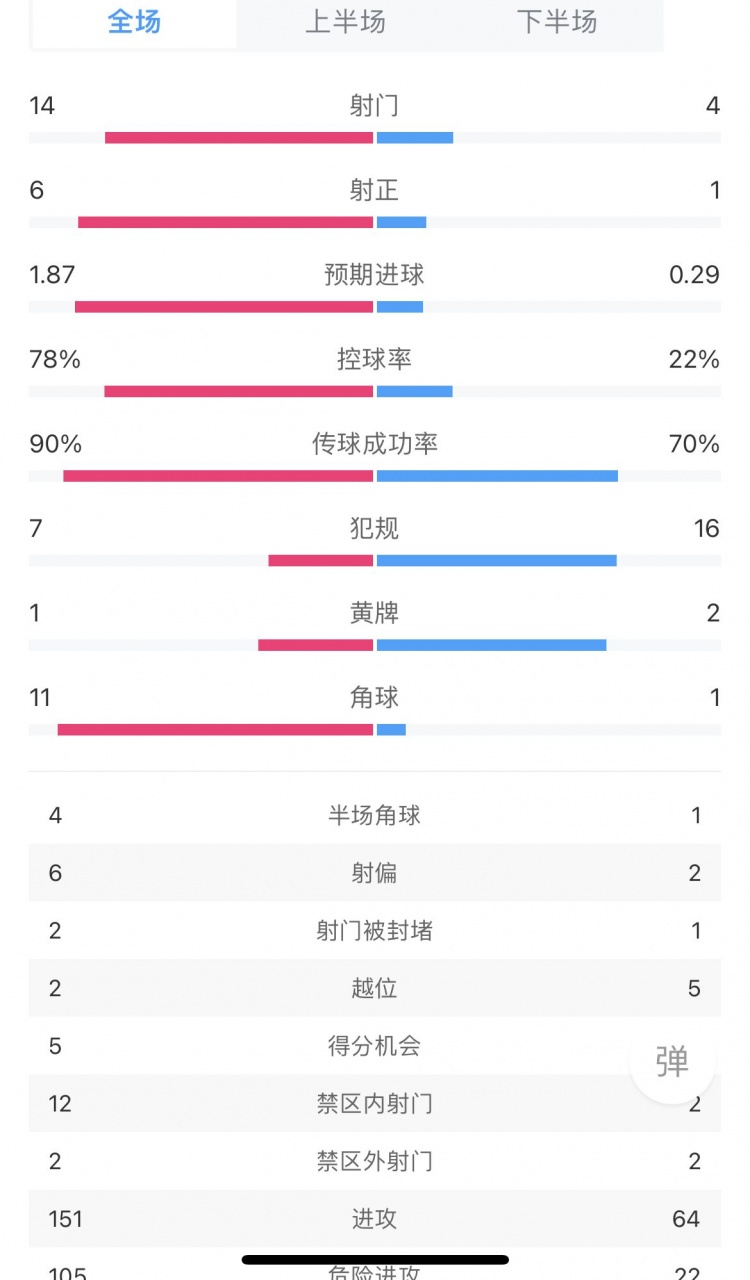 热刺3-1水晶宫全场数据:射门14-4&角球11-1 控球率78%-22%
