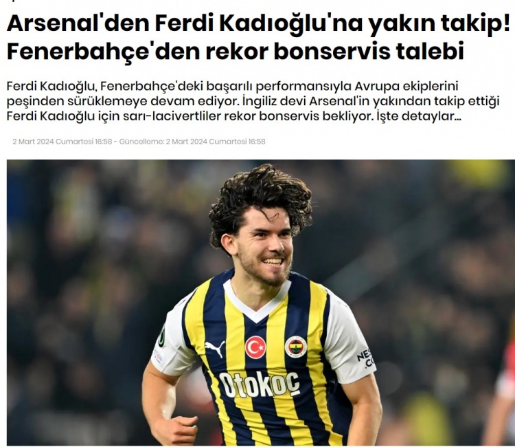 报道称,阿森纳将派球探来到费内巴切现场考察卡迪奥卢,除了阿森纳之外,那不勒斯也对这位土耳其国脚感兴趣,因此阿森纳将面临一场激烈的球员争夺战。