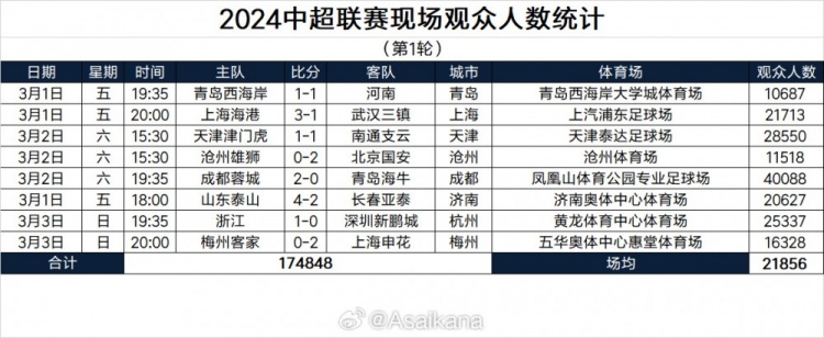 2024中超联赛现场观众人数统计(第1轮) ​​​