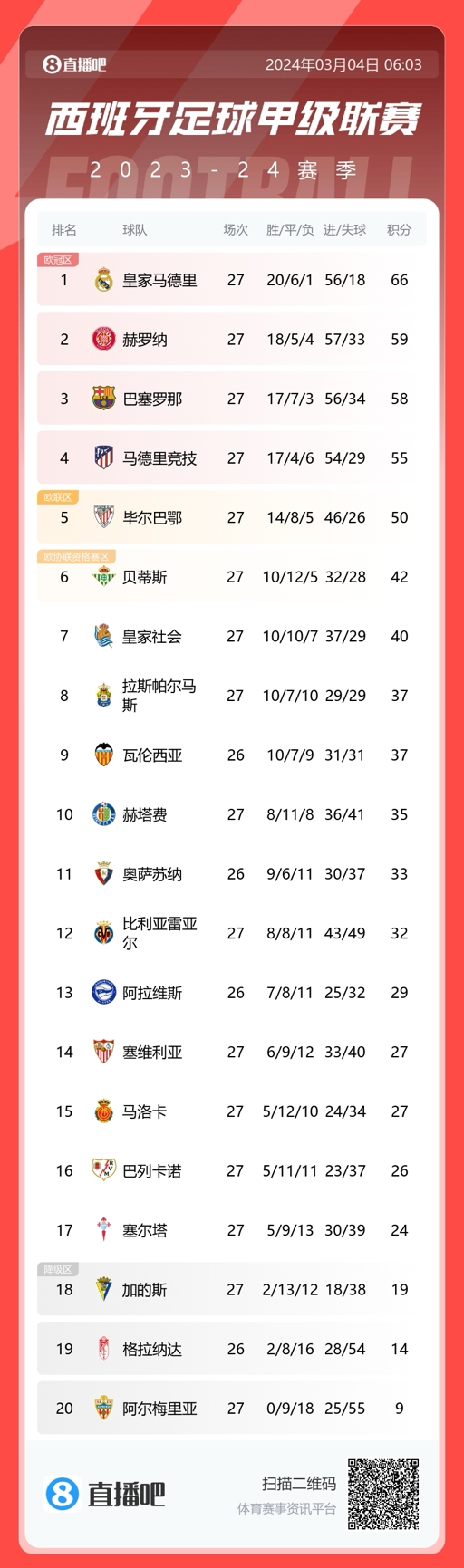 西甲积分榜:巴萨闷平距榜首8分,赫罗纳翻车距榜首7分