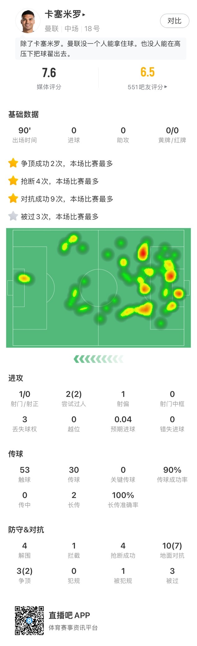 卡塞米罗全场数据:评分7.6队内第二高,解围4次&抢断成功4次