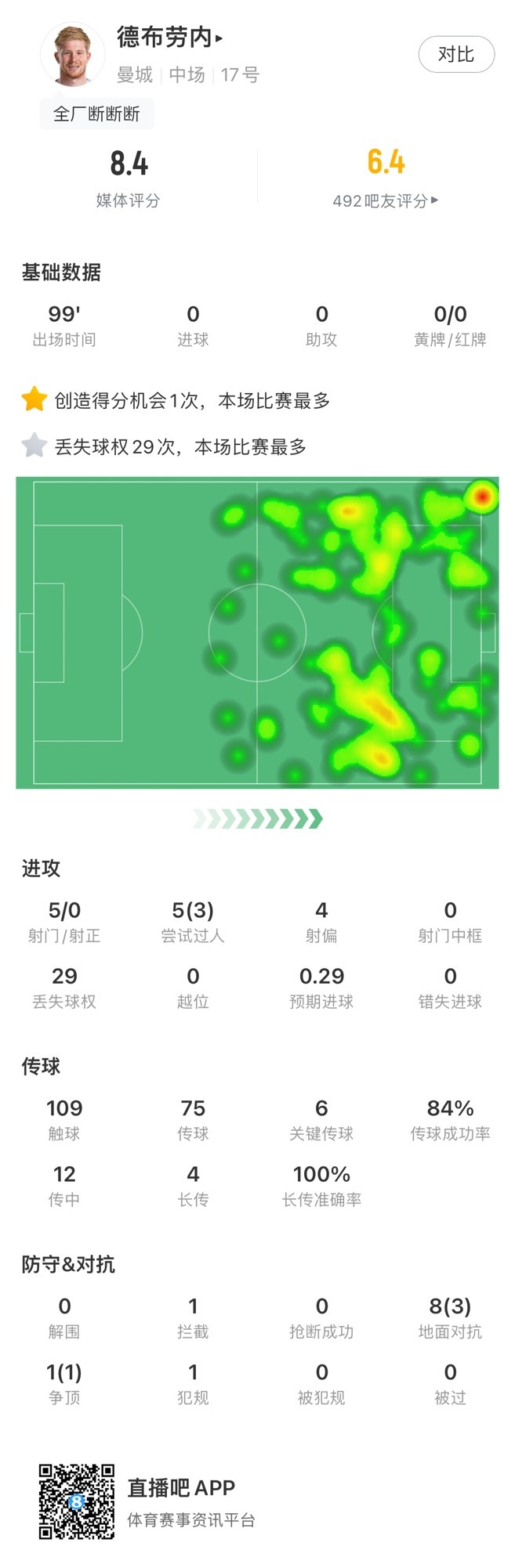 德布劳内全场数据:评分8.4分,关键传球6次&长传成功率100%