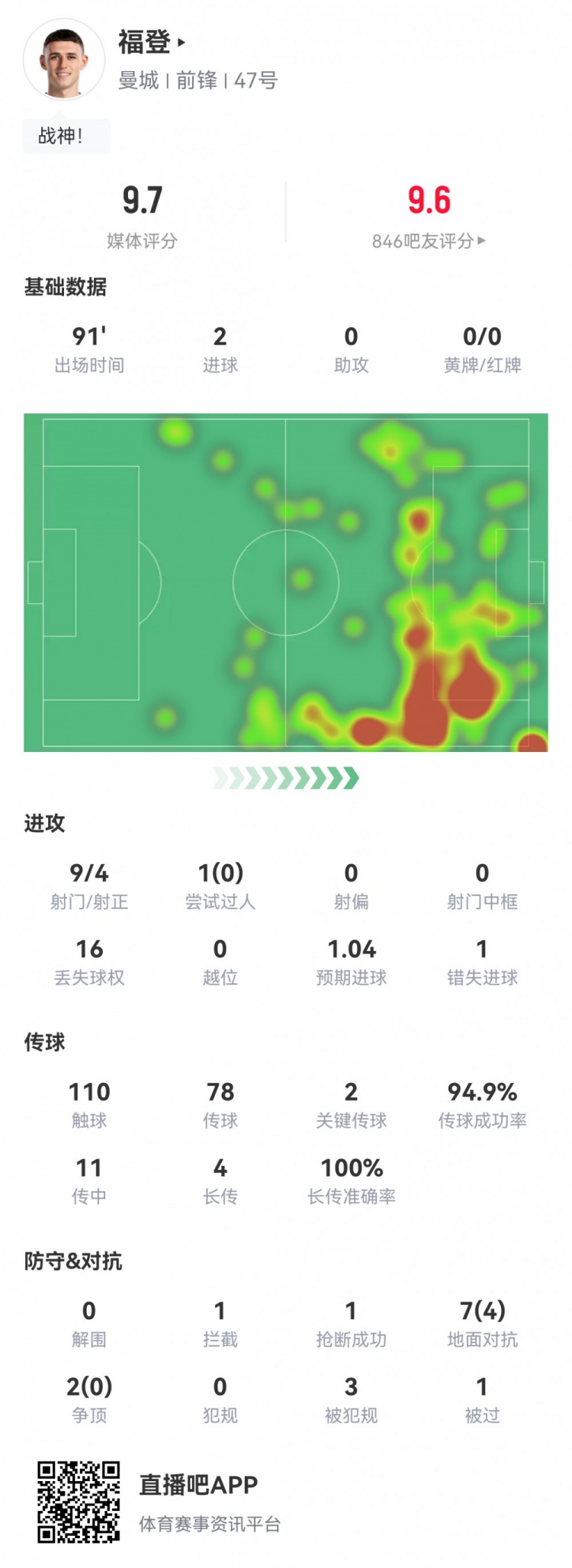 福登全场数据:9射4正2进球 2次关键传球 评分9.7全场最高