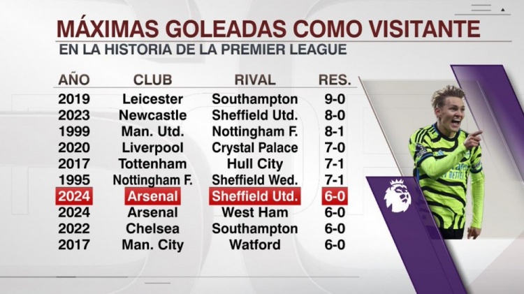 3月5日讯 在北京时间今天凌晨进行的英超第27轮比赛中,阿森纳客场6-0大胜谢菲联。ESPN列出了英超历史最大比分客场胜利排名,本场比赛在列。英超历史最大比分