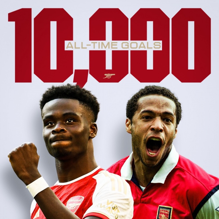 据阿森纳官方统计,枪手已经在各项赛事中攻入10000球,阿森纳官方账号晒出海报,庆祝球队达成这一里程碑。