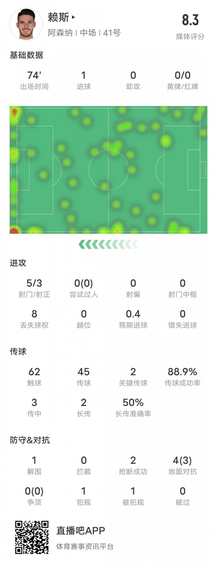 赖斯本场比赛数据:1进球2关键传球2抢断3射正,评分8.3