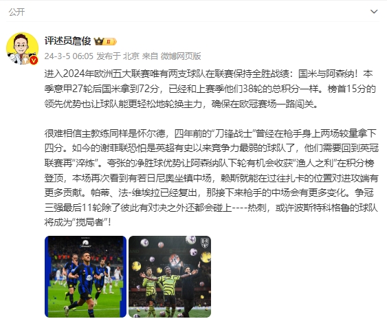 03月05日讯 今夜五大联赛,阿森纳6-0谢菲尔德联,国米2-1热那亚。知名评述员詹俊点评了这两场比赛。詹俊:进入2024年欧洲五大联赛唯有两支球队在联赛保持全胜战