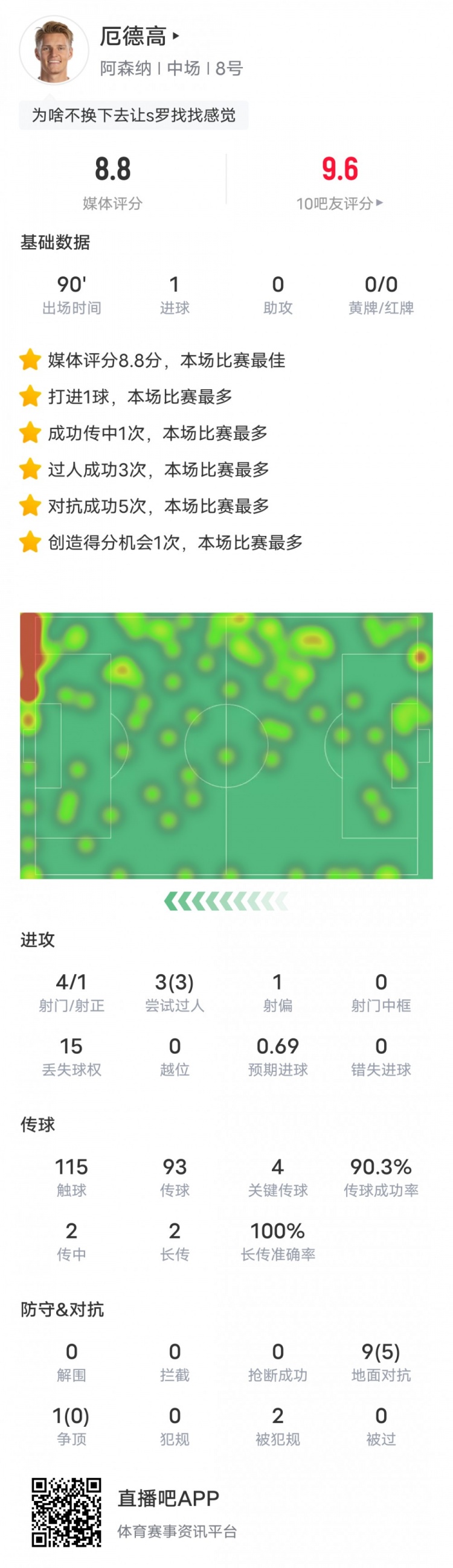厄德高本场数据:1进球4关键传球3过人成功,评分8.8全场最高