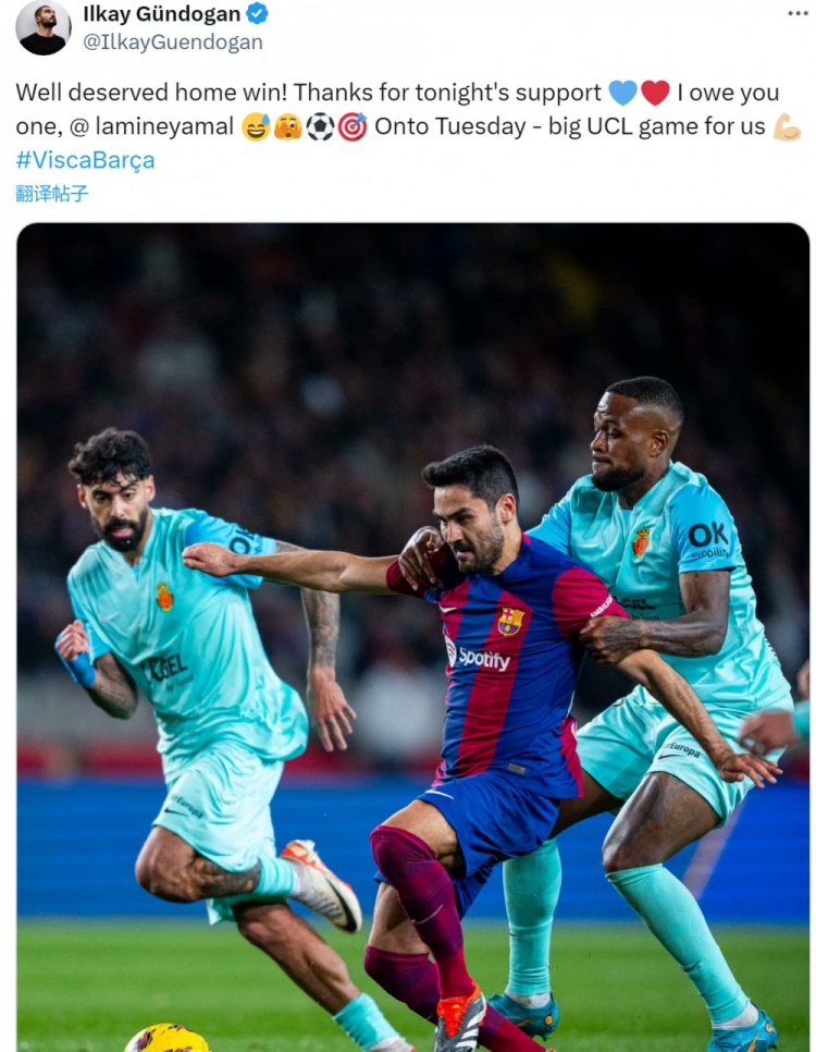 赛后京多安在社交媒体上晒出自己的比赛照片,并写道:“当之无愧的主场胜利!感谢球迷今晚的支持。我欠你一个人情,亚马尔。注意力转移到下周二,我们将迎来一场重要的欧冠比赛。”