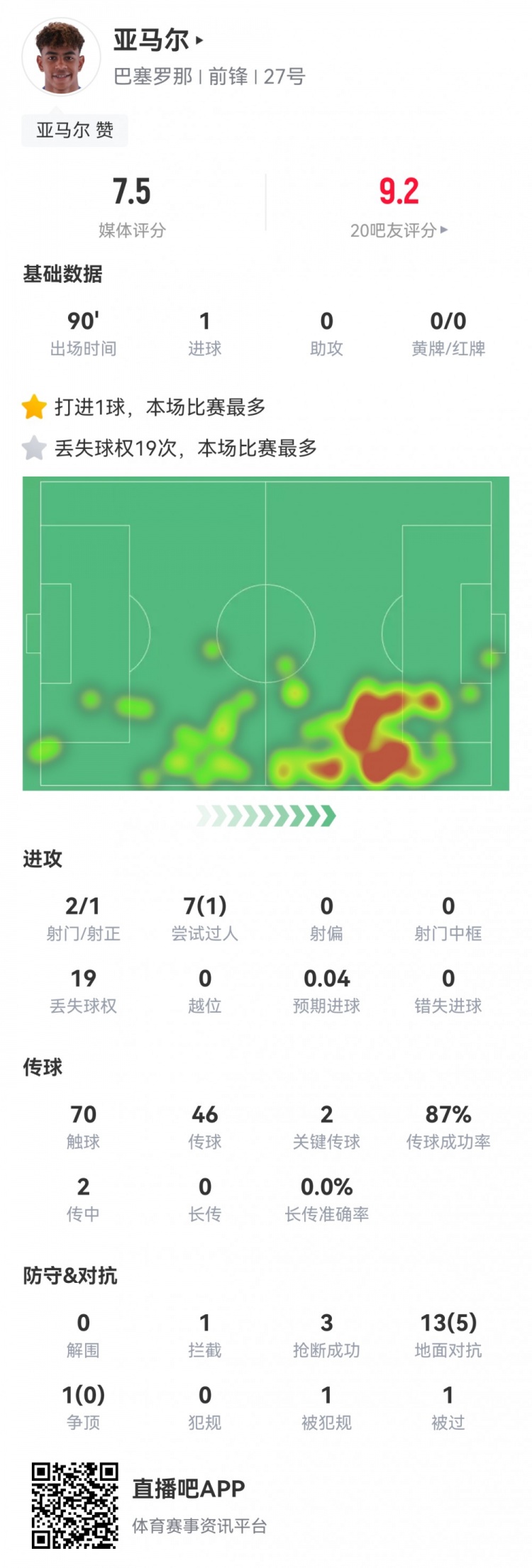 亚马尔本场数据:2射1正打进制胜世界波,2次关键传球,获评7.4分
