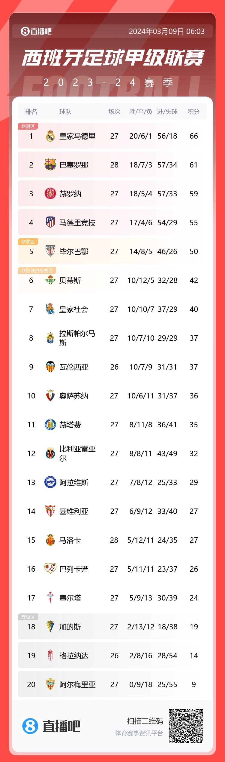 西甲积分榜:巴萨先赛取胜暂升第二,距榜首皇马5分