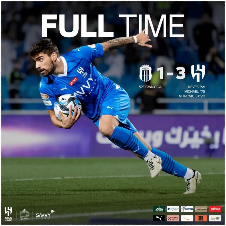沙特联第23轮,利雅得新月客场挑战利雅得体育,新月三次获得点球,米特洛维奇失点+点射,鲁本-内维斯点射,最终利雅得新月3-1逆转利雅得体育,追平27连胜的足坛纪录,新月12分领跑积分榜。