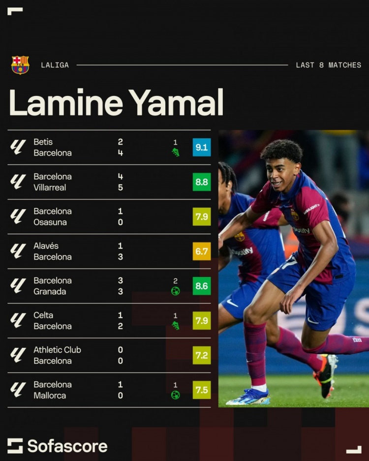 据Sofascore统计,亚马尔近8次西甲出场打进3球并送出2记助攻,场均成功过人2.6次,对抗成功7.8次。