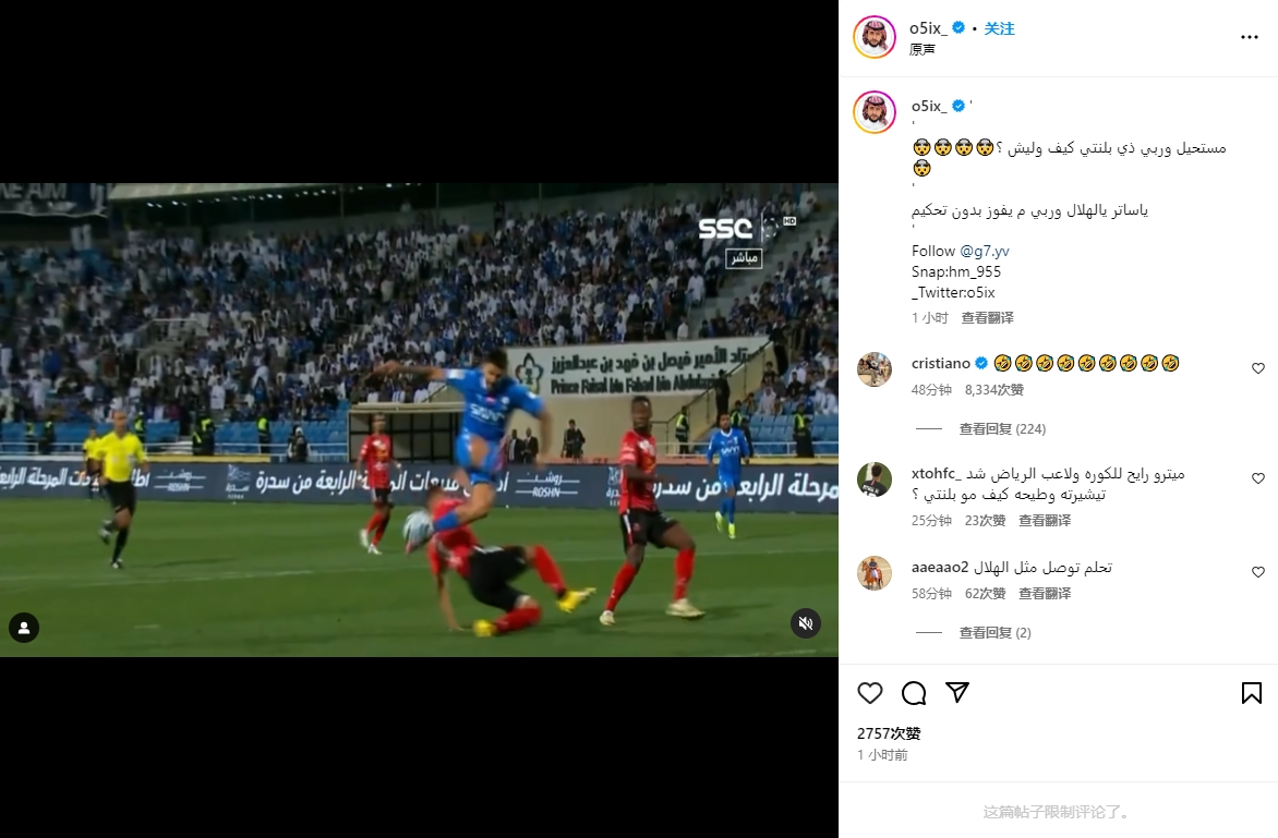 赛后,球迷晒出利雅得新月第二次获点的视频并质疑新月获得这么多点球,C罗在这篇帖子下评论: