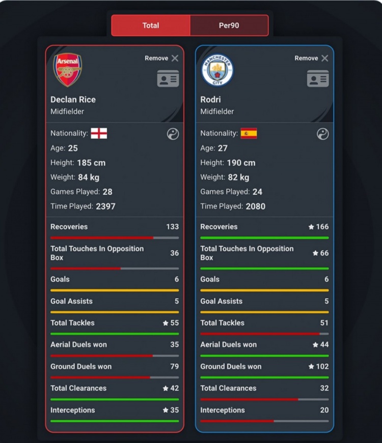 赖斯、罗德里本赛季英超数据: