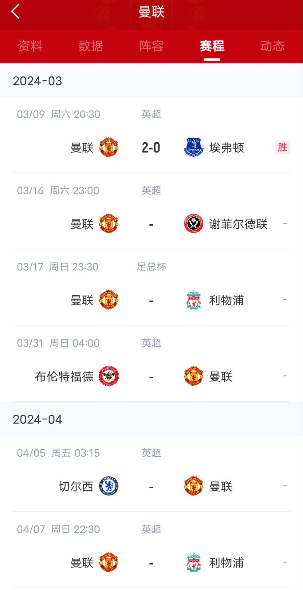 03月10日讯 本轮英超,曼联2-0击败埃弗顿结束英超两连败。曼联未来一个月的赛程并不容易,他们将在足总杯1/4决赛对阵利物浦,随后在英超还将遭遇切尔西以及再次