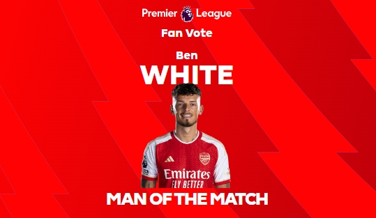 2助攻,官方:本-怀特当选阿森纳vs布伦特福德全场最佳