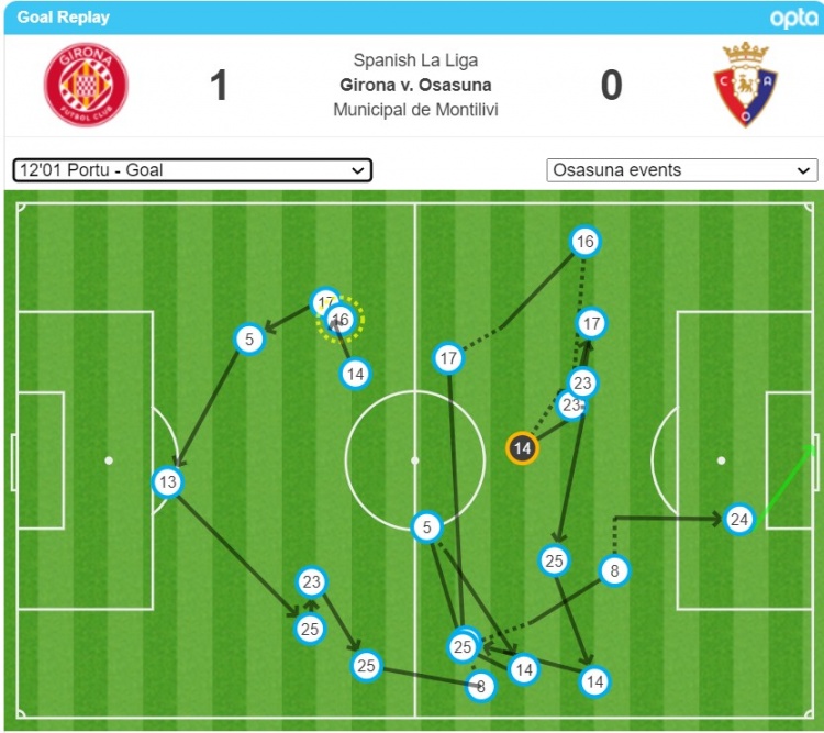 此役波图第12分钟为赫罗纳首开记录,这粒进球通过连续多脚传球打进,据Opta统计,赫罗纳本赛季联赛通过20+连续传球打进4球,至少是其他西甲球队的两倍(皇马、拉斯帕尔马斯2球)。