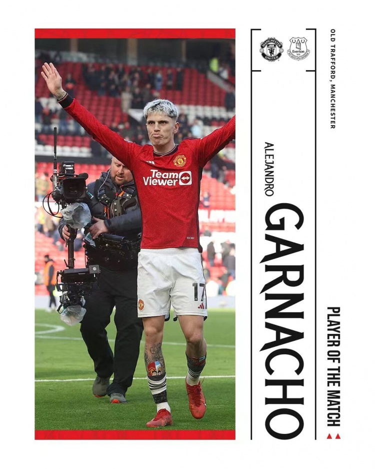 3月9日讯 英超第28轮,曼联主场2-0击败埃弗顿。赛后,曼联官方宣布,加纳乔当选了本场比赛的队内最佳球员。
