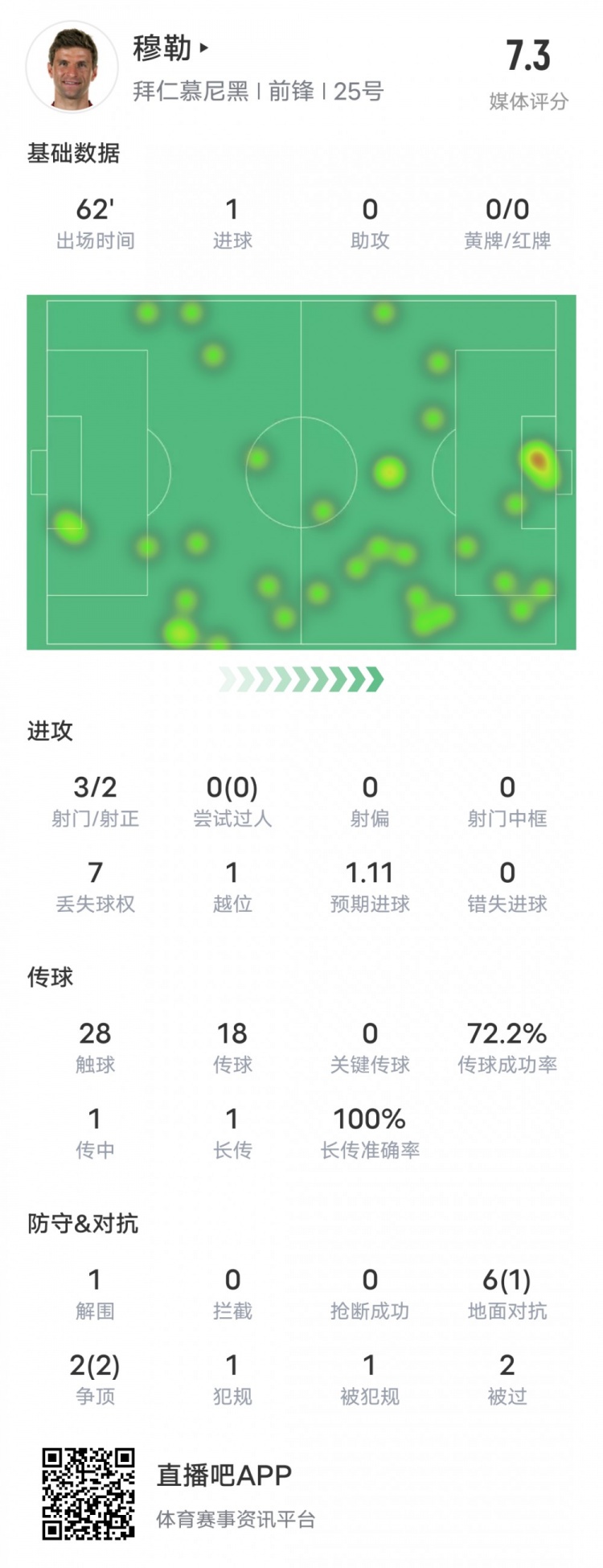 穆勒本场比赛数据:1进球2次争顶成功,评分7.3