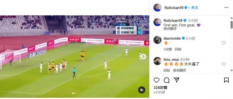 赛后,菲奥里奇在社媒晒出了进球视频,并为此配文写道:“第一场胜利,第一个进球!”