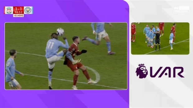 3月11日讯 利物浦1-1战平曼城,比赛第90+9分钟,多库解围没收住脚,踢中麦卡利斯特前胸!VAR介入后没给点球!