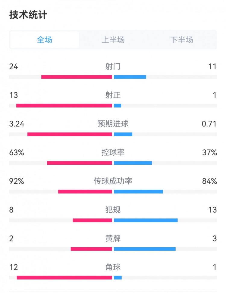 3月11日讯 本轮西甲皇马4-0塞尔塔,双方全场数据对比如下↓射门24-11射正13-1预期进球3.24-0.71控球率63%-37%传球成功率92%-84%犯规8-13黄牌2-3角球12-1