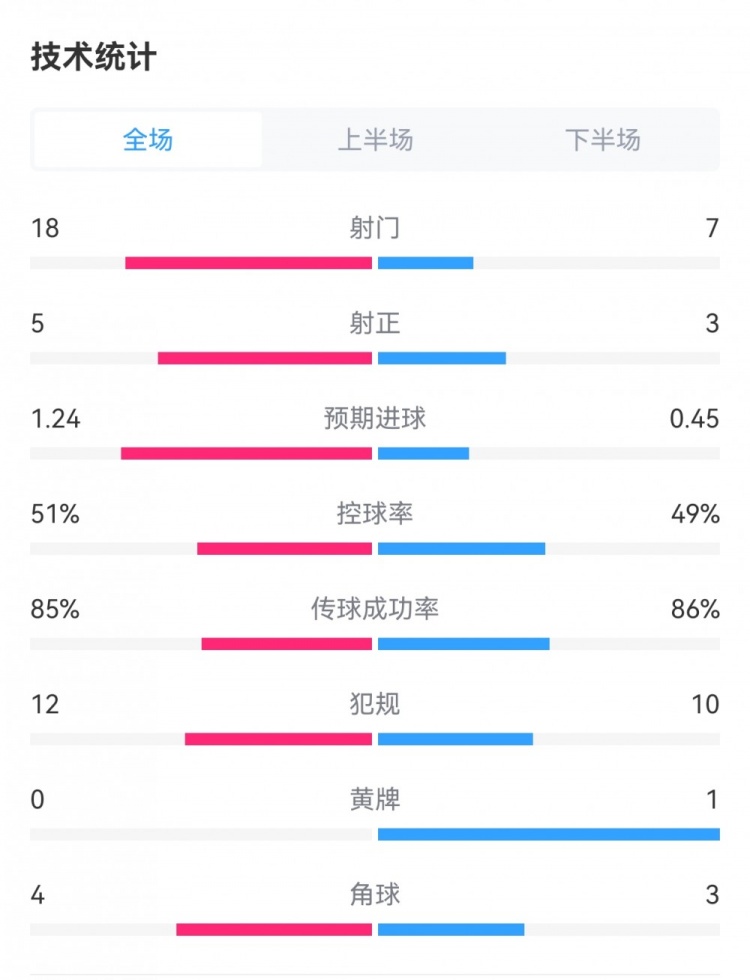 3月11日讯 本轮意甲尤文2-2亚特兰大近七轮仅1胜,双方全场数据对比如下↓射门18-7射正5-3预期进球1.24-0.45控球率51%-49%传球成功率85%-86%犯规12-10黄牌0-