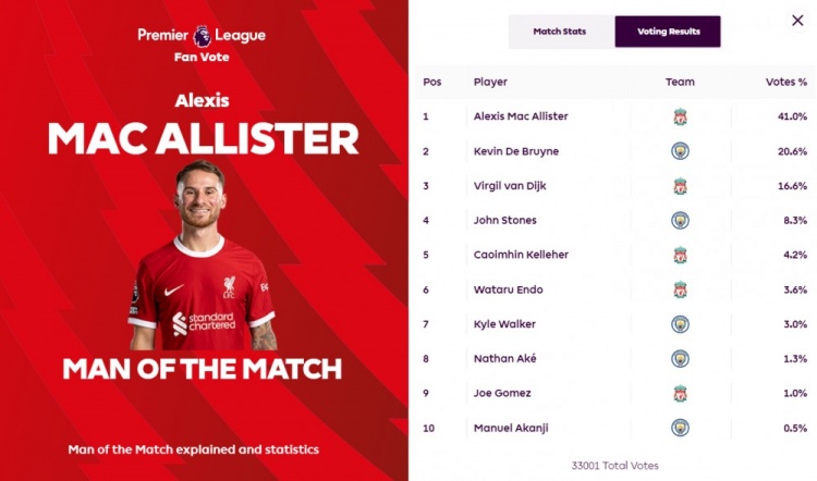 3月11日讯 本轮英超焦点战,利物浦主场1-1曼城。麦卡利斯特点射建功帮助利物浦扳平比分,赛后球员也是当选英超官方票选的全场最佳球员。此次票选共有33001人