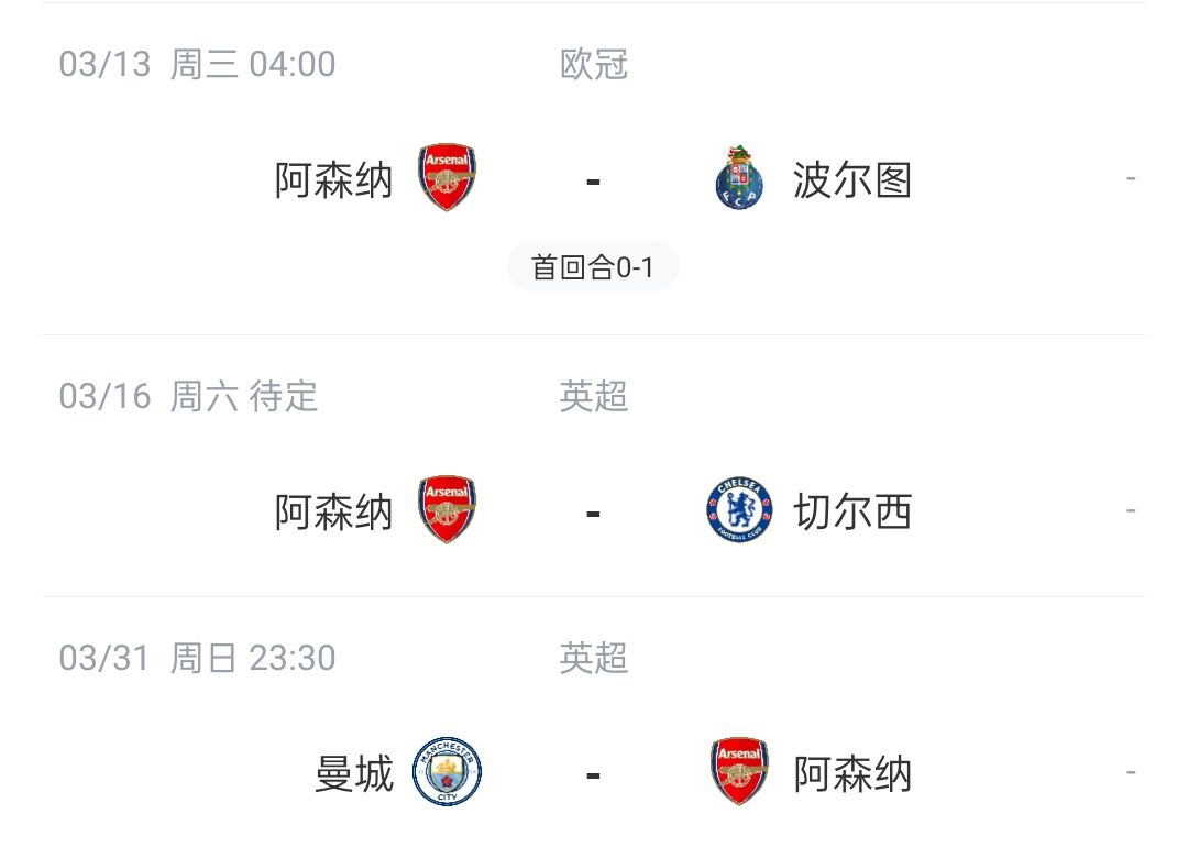 之后阿森纳将连续迎来硬仗,周中主场欧冠对阵波尔图(首回合0-1),月底客场对阵争冠对手曼城。