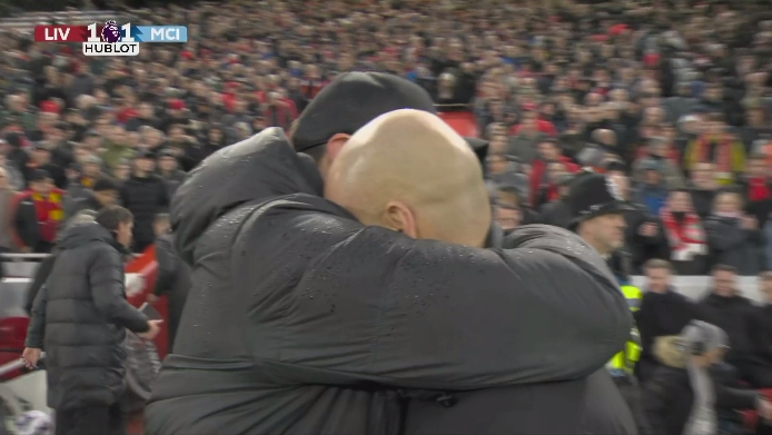 3月11日讯 英超第28轮焦点战,利物浦主场1-1战平曼城。裁判吹响终场哨后,克洛普走向瓜迪奥拉,二人长时间相拥。此前利物浦官方宣布,克洛普本赛季结束后卸任球队