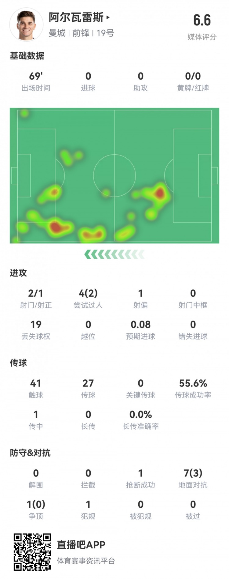 3月11日讯 本轮英超焦点战,利物浦主场暂1-1曼城。阿尔瓦雷斯首发出战69分钟发挥不佳,球员全场重点数据如下↓2射1正4次过人成功2次41次触球传球成功率15/27(5