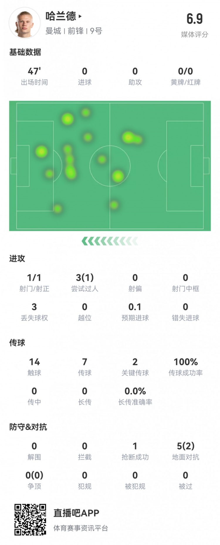 数据方面,哈兰德1射门1射正,3次尝试过人1次成功,14次触球,7次传球,2次关键传球!5次地面对抗2次成功,评分6.9分。