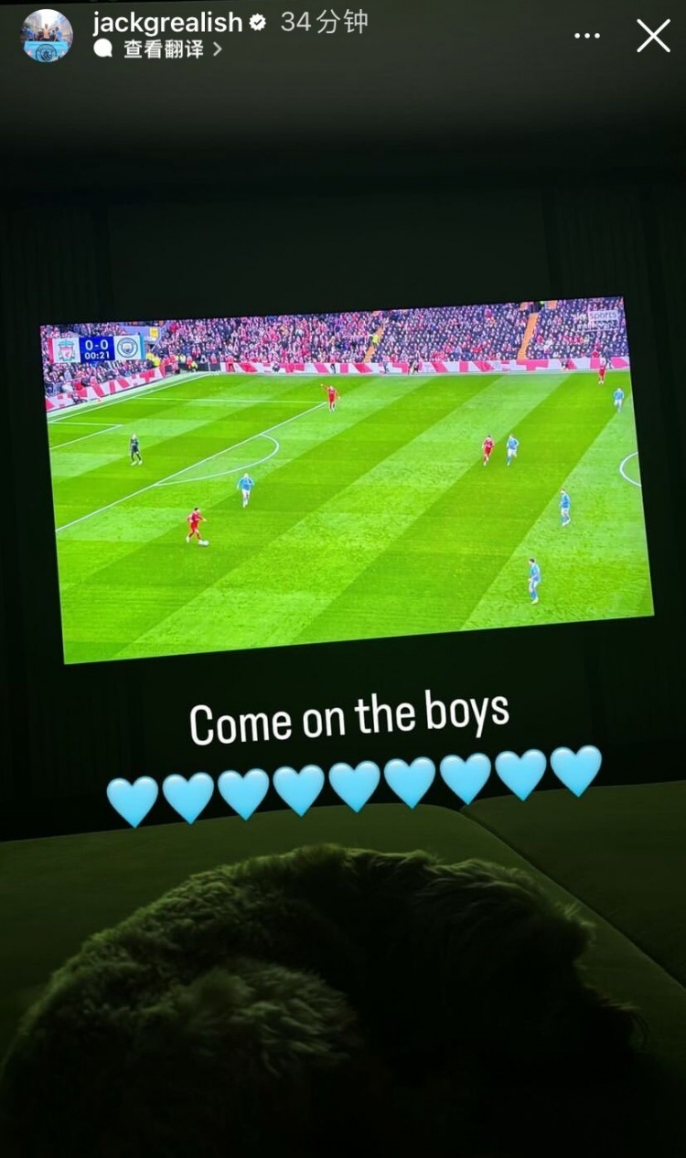 受伤的格拉利什在家中观战曼城vs利物浦:加油啊,小伙子们!