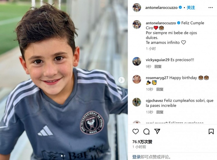 安东内拉晒出小西罗身穿迈阿密国际训练服的照片,并写道:西罗,生日快乐!你永远是我拥有可爱眼睛的宝贝,我们永远爱你❤