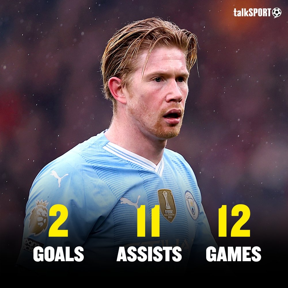 大师!德布劳内2024年12场2球11助,英超球员最多