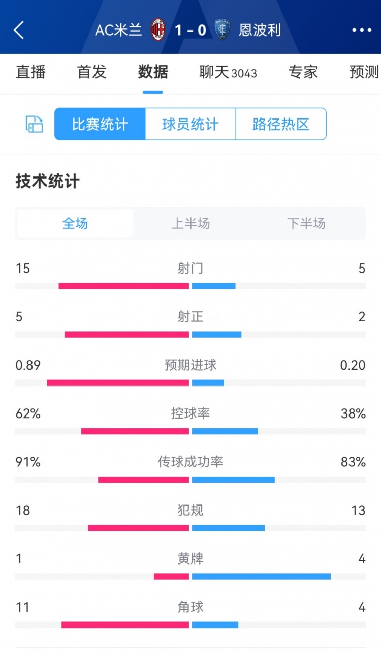 米兰1-0恩波利全场数据对比:射门15-5,射正5-2,角球11-4