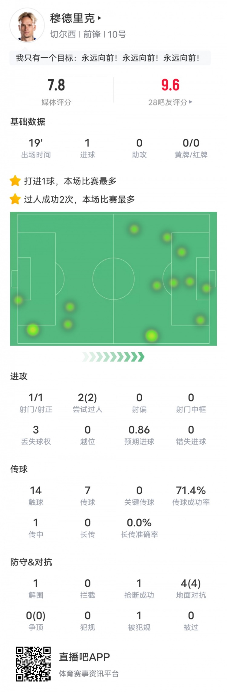 穆德里克本场数据:1进球2成功过人4地面对抗全部成功,评分7.8