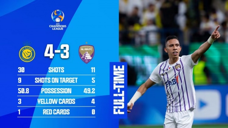 亚冠8强次回合,利雅得胜利点球大战5-7不敌艾因,C罗失良机后造点并罚进。利雅得胜利止步8强。亚冠出局后,球队可争夺的锦标基本只剩下沙王冠。