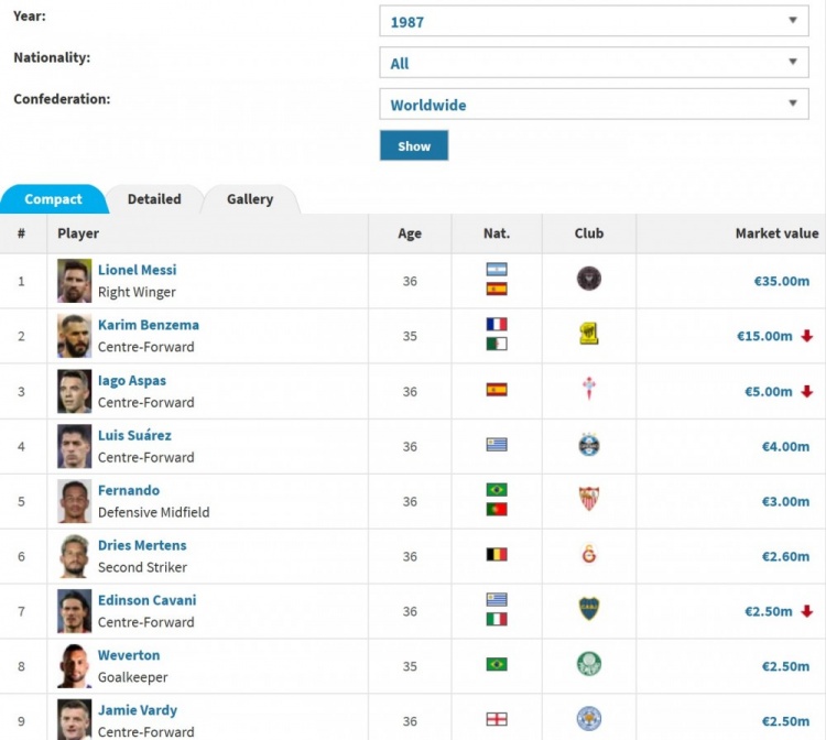 本泽马身价持续跌至1500万欧,1987年出生球员中仅次于梅西