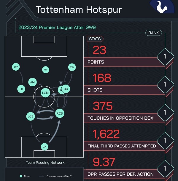 从统计数据可以看到,波斯特格鲁接手后的热刺,打出了相当好的整体性,眼下有7项数据领跑英超。