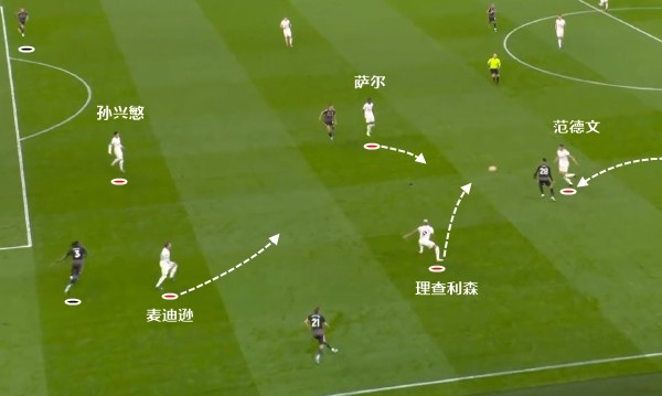 哪怕是中卫位置,无论是罗梅罗还是范德文,都是频繁前顶。这一次的进攻,第一波是孙兴慜丢球后反抢,随后又丢掉了球权,再紧跟着继续高位逼抢,范德文制造对手失误,麦迪逊得球后直塞,让孙兴慜获得直面门将的机会。