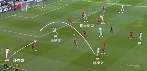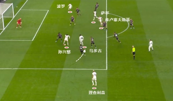 这一波进攻中,理查利森传给进禁区的乌多吉是起点。随后乌多吉横传,孙兴慜横移后,乌多吉再前插禁区肋部,几乎形成进球的射门机会。