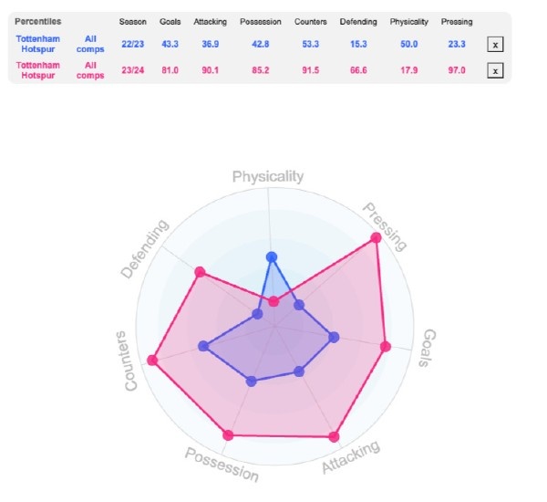 从对比数据可以看到,本赛季的热刺比上赛季要全面进步,尤其是在进球、射门和控制球权方面,有着极大的提升。