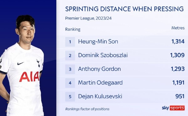 从统计数据可以看到,本赛季的孙兴慜,他的冲刺压迫距离英超第一,排名第五的是他的队友,主打右边锋的库卢塞夫斯基。